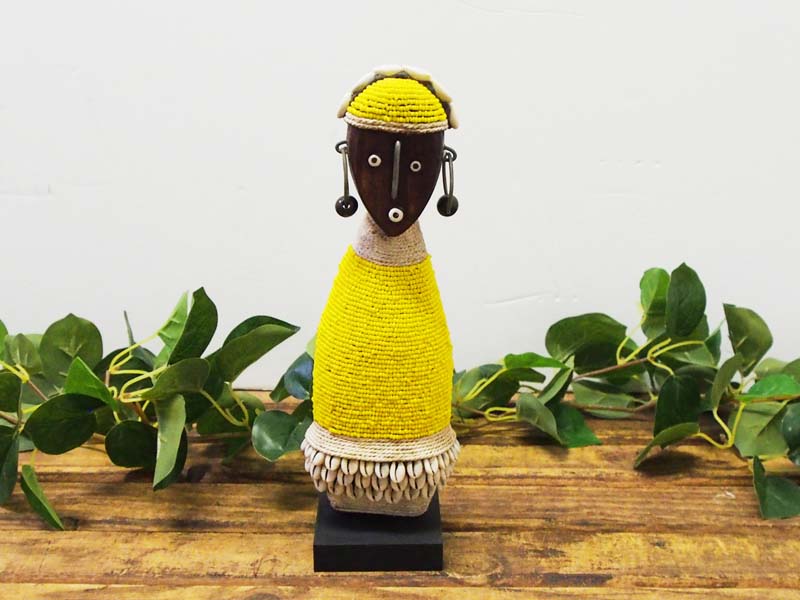 The Namji dolls are adorned with Cowrie shells and a variety of colourful beads and stand on a wood base. Each doll is crafted individually making them unique and a one of a kind piece.